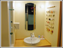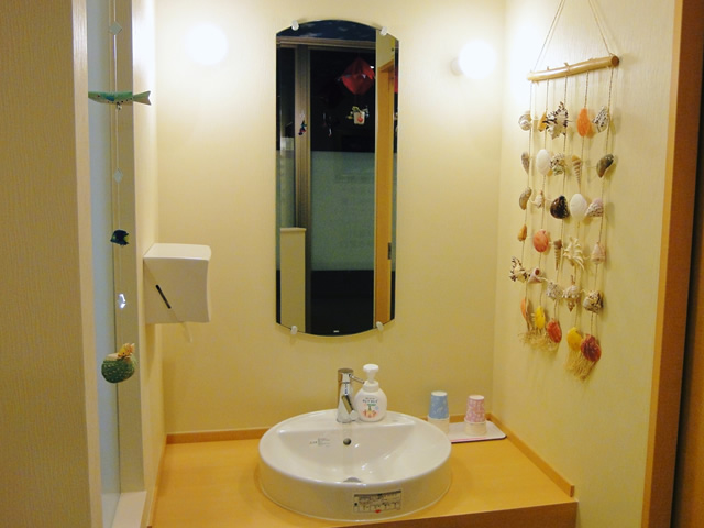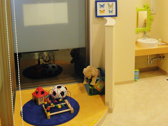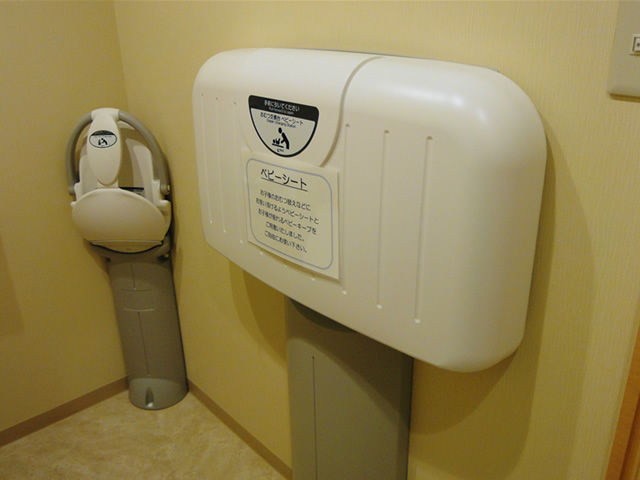 お手洗い。おむつ替え用シートやチャイルドシートも完備。ご希望の方には子供用便座もご用意しております。スペースを広く取っていますので、