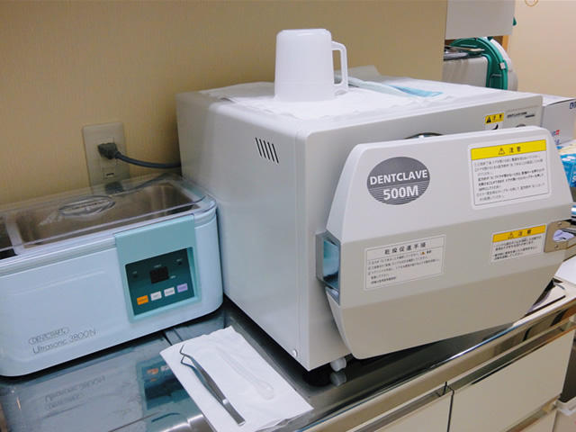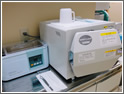超音波洗浄機とオートクレーブ(高温高圧蒸気で滅菌する器械)。