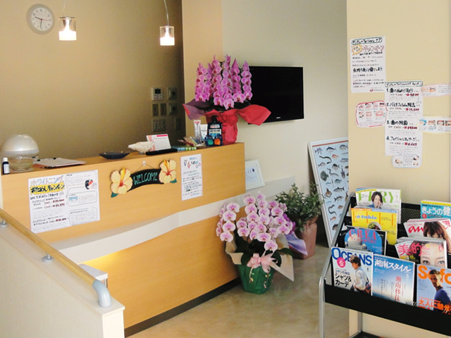 受付。気軽にお越しいただけるように、歯医者さんらしさを極力感じ