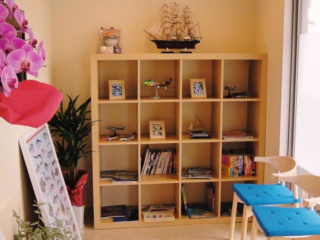 待合スペース。「空、海」がテーマです。TVはもちろん、幅広い年代の方にお読み頂ける本も多数そろっています。付き添いの方も退屈させません!